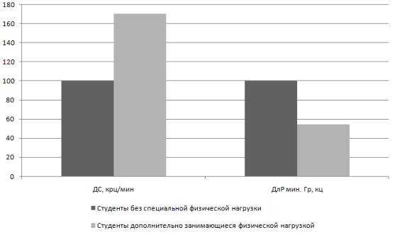 В работе проведен анализ наблюдений исследуемых студентов в возрасте от 18 до 21 года (60 человек). Первая группа студентов была без специальной физической нагрузки (35 человек), вторая группа с дополнительной физической нагрузкой (25 человек). Цель исследования дать количественную объективную характеристику методов, используемых для совершенствования и укрепления здоровья, таких, как физические тренировки. Маленький диапазон синхронизации, большая длительность развития синхронизма на границах диапазона синхронизации у студентов без дополнительной физической нагрузки по сравнению с занимающимися спортом студентами указывают на снижение регуляторно-адаптивных возможностей организма в первой группе. В результате выявлено, что основные параметры СДС количественно зависят от наличия физических нагрузок в жизни человека. Представленные данные позволяют заключить, что дополнительные физические нагрузки благоприятно влияют на регуляторно-адаптивные возможности организма.