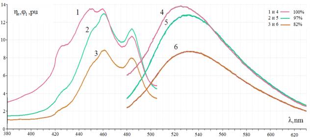 Fig.1. - The excitation and luminescence spectra of galega orientalis seeds: 3, 6 - unscarified; 2, 5 – slightly scarified;