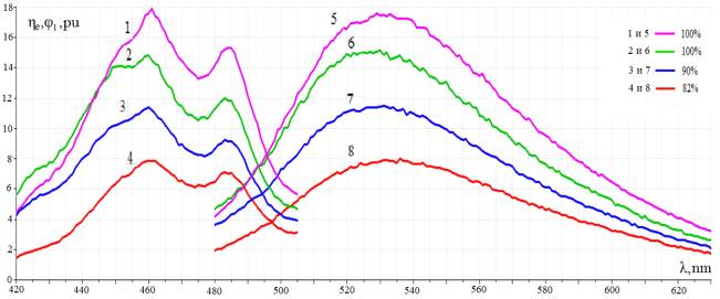 Fig.2. - The excitation and luminescence spectra of galega orientalis seeds: 4, 8 - unscarified; 3, 7 - measured immediately after the scarification; 2, 6 - measured