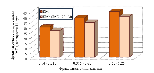 1 – Влияние размера фракций хвостов СМС на прочность композиции