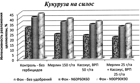 показал, что наиболее интенсивно целлюлоза разлагалась на удобренных фонах. На