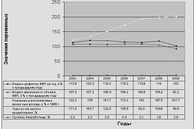 Индекс-дефлятор ВВП и уровень безработицы, 2003-2009 гг.