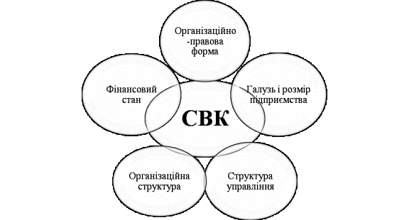 розмір підприємства (масштаб та вид діяльності), організаційна та управлінська