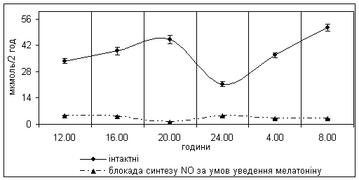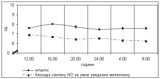 мелатоніну на фоні блокади монооксиду нітрогену призводило до істотних порушень
