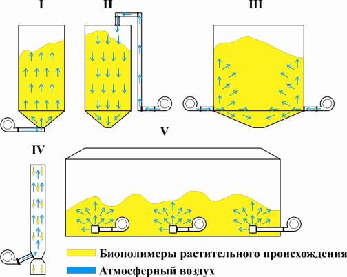 воздушной обработки биополимеров (см. рис. 1) в производственных бункерах (I, II), больших емкостях для хранения (III), потоковой респирационной обработке или