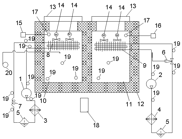 прибор; 19 – датчики измерительного прибора 18; 20 – насос.