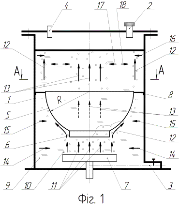 киснем. У верхній частині корпусу 1 висхідні потоки 13 утворюють газовий стовп