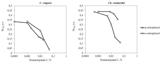(ФPSII) мікроводорості C. vulgaris і Ch. reinhardtii. Паранітрофенол