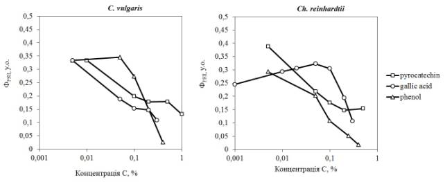 фенолу, пірокатехіну і галової кислоти на показник ФPSII у C. vulgaris і Ch. reinhardtii.