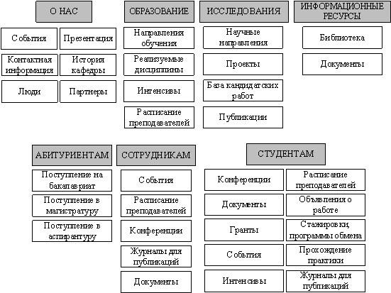 Вопрос выбора способа группировки подразделов было решено вынести на обсуждение с сотрудниками кафедры. В результате решено остановиться на комбинированном подходе, при котором информация общего характера о кафедре, а также информация, необходимая всем категориям пользователей, группируется тематически, а информация, специфичная для отдельных типов пользователей – по типам пользователей (см. рис.1).