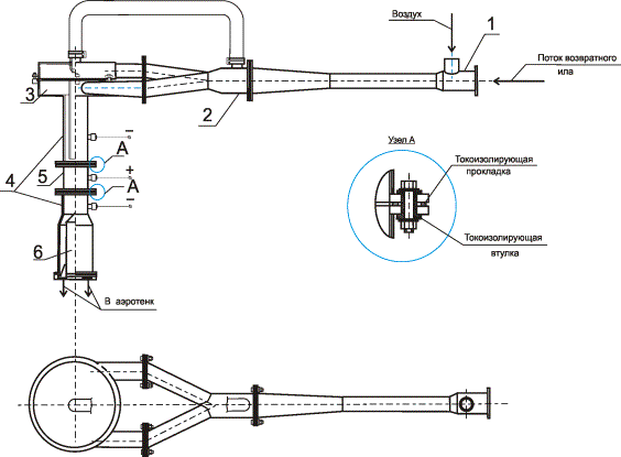 При перекачивании через эжектор потока возвратного ила происходит подсасывание атмосферного воздуха, в результате чего на выходе из эжектора образуется иловоздушная смесь. Для интенсификации процессов насыщения иловой смеси кислородом воздуха и реализации технологии ее электроактивации, нами была разработана конструкция электрогидродинамического устройства (ЭГДУ). ЭГДУ представляет собой устройство, состоящее из двух соосно соединенных камер: камеры входа (диаметром D) и ствола (диаметром d) (рис.1).