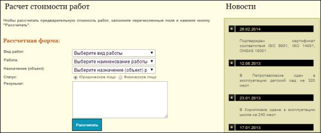 расчетная форма. На данной странице необходимо выбрать вид работ –