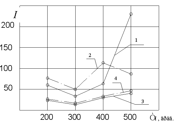 Рис.2 Інтенсивність зношування І ( І×10-10) сталі 50ХФА, з різним вихідним структурним станом, при Р = 10 МПа, V = 0,2 м/с: 1 – без покриття на повітрі; 2 – без покриття у