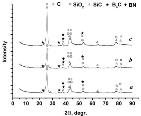 Дифрактограммы образцов углеситалла: a - исходного, b - с пропиткой 3-аминопропилтриэтоксисиланом, c - после пропитки