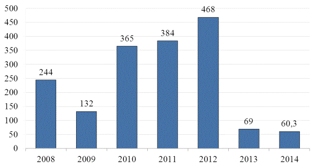 Рис. 2. Динамика инвестиций в основной капитал в 2010-2015 г. г, млн. дол.