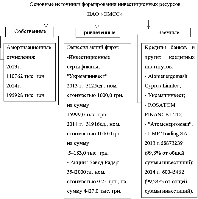 При осуществлении инвестиционных проектов на анализируемом предприятии, основными источниками формирования инвестиционных ресурсов выступили амортизационные отчисления, эмиссия акций, средства коммерческих структур, кредиты банков и других кредитных институтов [3].