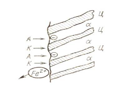 анодами: А- анод; К- катод; 1 - загрязнение; 2 - чистая поверхность металла; 3