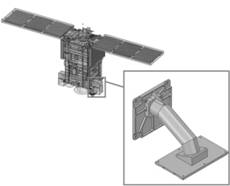 Кронштейна под прибор ориентации по Земле, для которого была проведена оптимизация топологии, представляет собой две металлические пластины, соединенные между собой полой трубой. На одной из пластин имеются четыре отверстия для крепления кронштейна к корпусу космического аппарата, на другой – шесть отверстий для крепления прибора. Кронштейн изготовлен из алюминиевого деформируемого сплава АМг6, и его масса составляет 2,27 кг. Масса самого прибора равна 2,7 кг. Центр масс прибора смещен от плоскости посадки по нормали на 60,5 мм. Узел и его расположение на космическом аппарате изображены на рисунке 1.