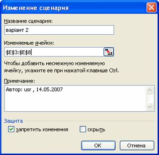 Сценарии. Відкривається діалогове вікно Диспетчер сценариев, у якому треба натиснути кнопку Добавить. У наступному вікні Изменение сценария (рис.3) задають ім’я для створення