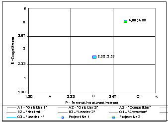 The projects which after positioning are in the sphere of “leaders” have the best or average index values of innovative attractiveness and competitiveness and are of higher priority,