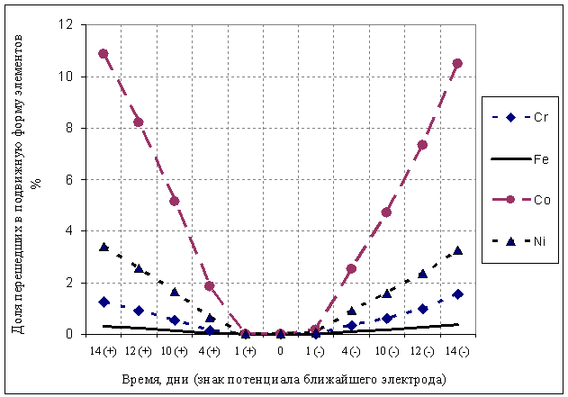 концентрации рудных элементов в зависимости от времени и знака потенциала