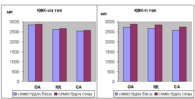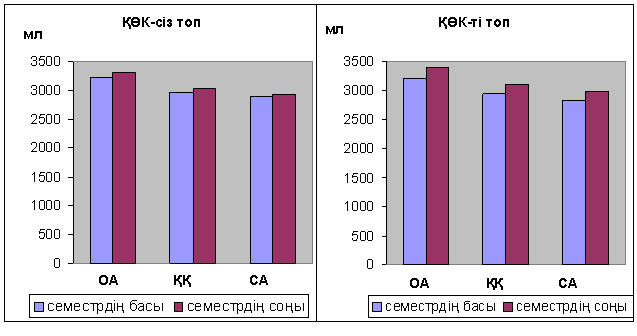 және 2895±102 мл болса, тыныс алу жаттығулары жүргізілген топта семестрдің басында оңтүстік,