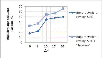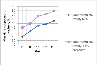 вологоємності ґрунту + «Теравет») на шосту добу проросло 40 %. Всього до 31-ї доби