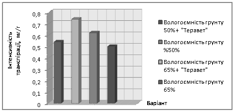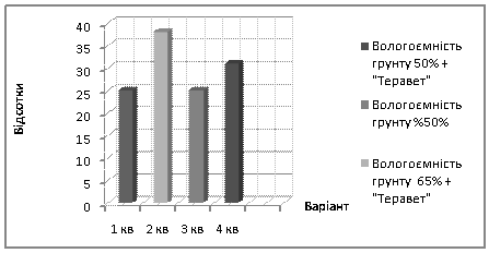 ґрунту – 50 % + «Теравет»; 3) вологість ґрунту – 65 %; 4) вологість ґрунту – 65 % + «Теравет». У польових умовах норма