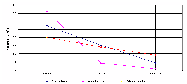 слоя - 44,3%, у сорта Достойный - 46,3% и 44,7%, у сорта Кристалл -45,1 %