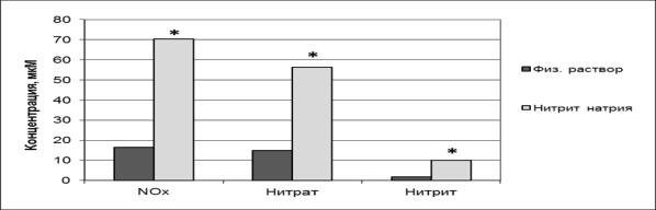 NOx и NO3¯ через 60 мин после введения NaNO2 в экспериментах без применения