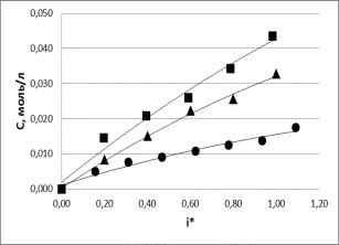 концентрации кислоты при электродиализе, V1 и V2- скорости подачи растворов сульфата натрия и кислоты соответственно: 1) V1/V2 = 1:1; 2) V1/V2 = 3:1; 3) V1/V2 =10:1.
