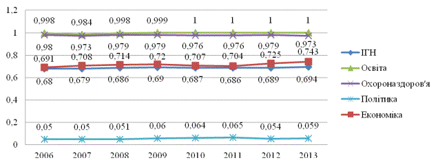 насамперед, за рахунок максимальних значень індексу у сфері політики (рис. 2).