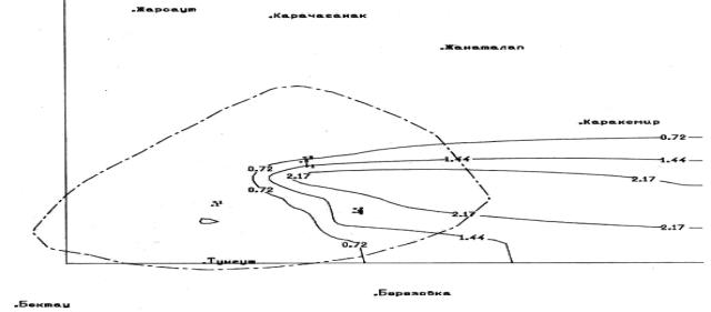 Изолинии концентрации СО2 в долях ПДК на высоте 10 м. Мах СО2 – 2,89