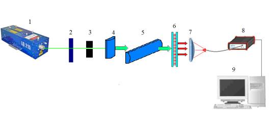 цилиндрические линзы; 6 - исследуемый образец; 7 - собирающая линза; 8 - cпектрометр