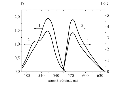 Рисунок 3 - Спектры поглощения (1,2) и флуоресценции