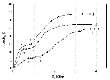 показано, что с ростом напряженности электрического поля (НЭП) относительное
