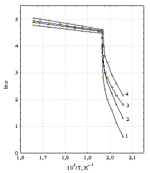 Видно, что проводимость расплава с понижением температуры практически уменьшается линейно (в пределах Т = Тпл +100 К). При Т = 520 К (точка плавления) проводимость резко падает, причем, в неактивированном высоковольтными импульсами расплаве, практически до нуля (кривая 1). Температурная зависимость проводимости активированного расплава также подчиняется линейному закону, но температурный коэффициент в этом случае увеличивается. Чем выше уровень активации (амплитуда импульсного напряжения), тем больше температурный коэффициент проводимости, т.е. увеличивается угол наклона на кривых lns - 1/T, а, следовательно, энергия активации проводимости. Энергия активации предельной проводимости (0,123 эВ) в 1,5 раза больше низковольтной (0,082 эВ).