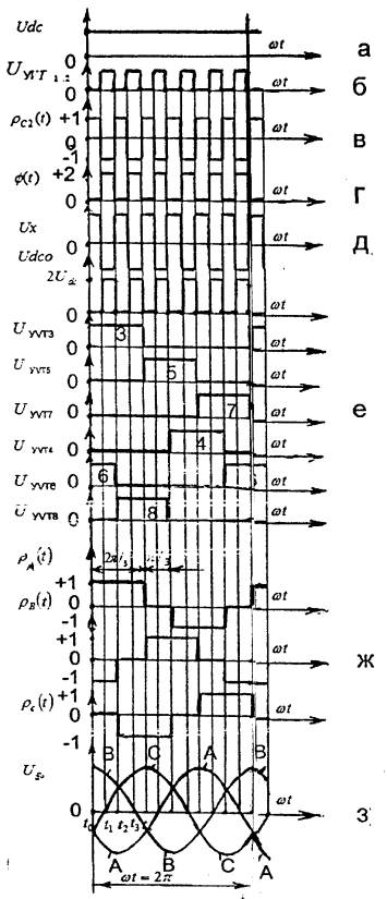 обеспечения закона переключения транзисторов VT3¸VT8 принимаем соответствующие расположения импульсов управления (рис. 2,е).