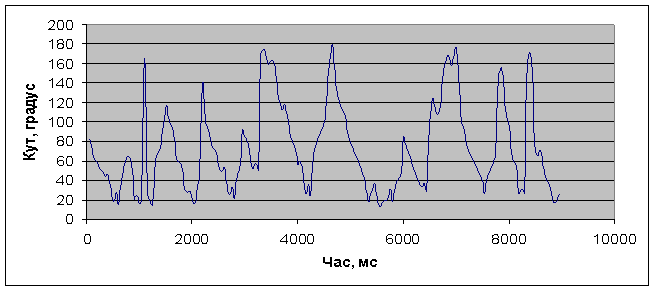 кутів при підйомі та опусканні руки наведений на рис.2 в залежності від часу.