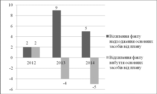 надходження і вибуття основних засобів від планового за 2012-2014 роки.