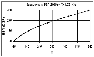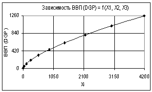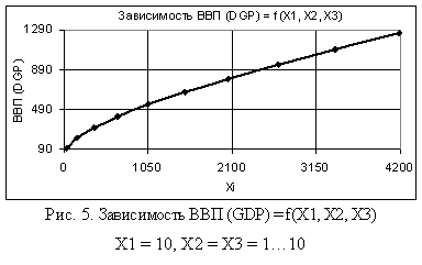 10…1, Х2 = Х3 = 1…10. В данном примере полученная зависимость ВВП (GDP) = f(Х1, Х2, Х3) изменяется также по степенному закону, при этом коэффициент