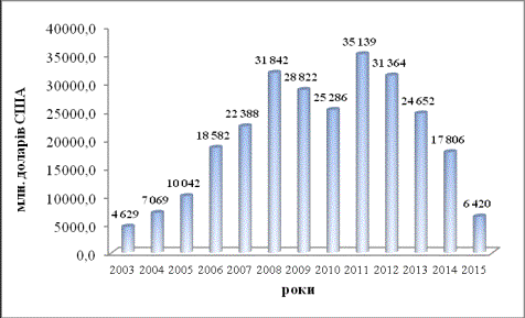 Рис. 2. Динаміка офіційних резервів України за 2003-2015 рр. [2]