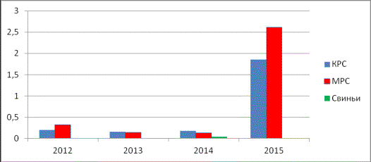 значительных пределах: у крупного рогатого скота от 0,2% (2012) до 1,85 %