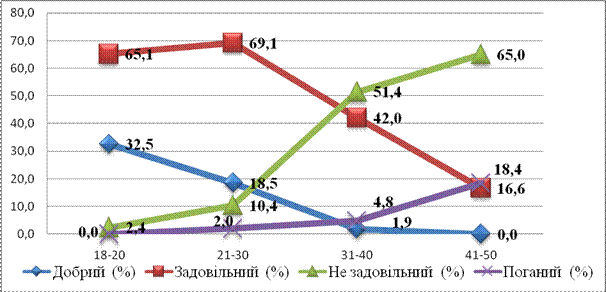 із «незадовільним» рівнем гігієни від 2,4 % (18 – 20 років) хворих до 65,0 % (віком 41 – 50 років) хворих.