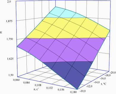 Analysis of the graphs showed that with the increase in the value of the boiling point of the refrigerant concentration multiplicity decreases monotonically. Increasing the solids content in the original serum and increasing the screw speed also causes a decrease in the value of the concentration ratio.From the analysis depending on the multiplicity of the concentration of the solids content of the starting material can be seen that the increase in dry matter content in the original serum reduces the degree of condensation, characterized by the value of the concentration ratio. This is due to the fact that with increasing solids content in the original serum values causes an increase in heat and mass transfer resistance , thereby slowing the passage of moisture in the solid state, which requires more time and energy consumption for freezing it [2].