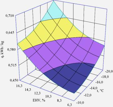 Fig. 2. Dependence of the specific energy consumption for refrigeration concentrationcheese whey at a frequency of rotation of the mold n = 0,152 with screw - on-1initial solids content in cheese whey EHV % and temperaturemold wall t, °C