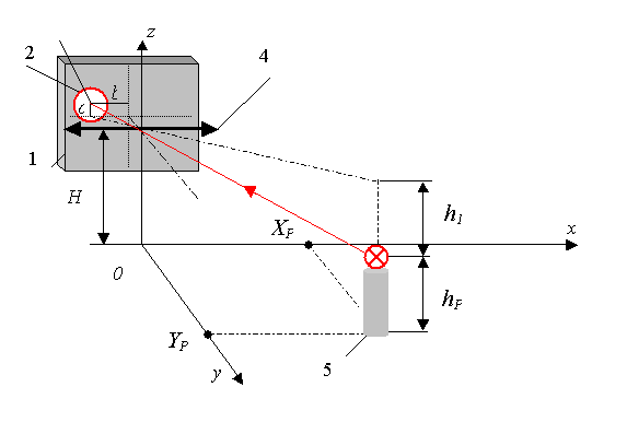 5 – вимірювальний перетворювач дефектоскопу, Н – висота оптичної системи над поверхнею сканування.