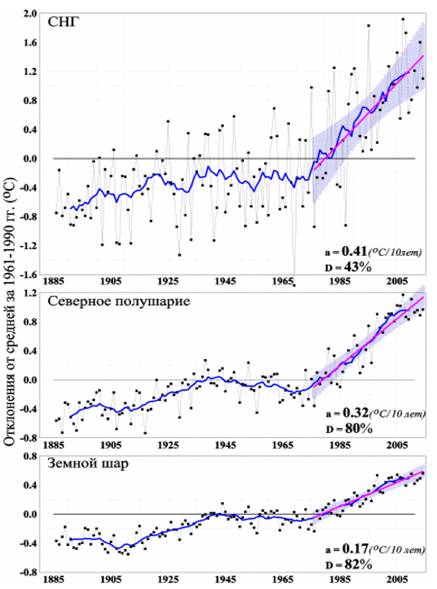 для суши Северного полушария 0,32оС/10 лет, для территории СНГ 0,41оС/10