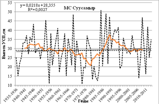 высоты устойчивого снежного покрова (- - -), кривые 11-летних скользящих