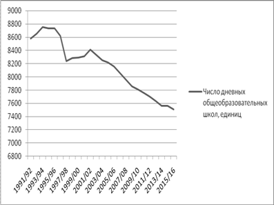 1990 по 2016 год, мы можем наблюдать, как нестабильное количество дневных школ